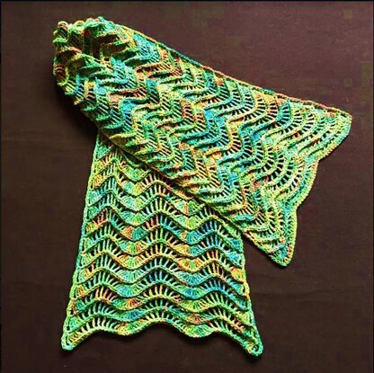 This lacy scarf or wrap uses the beautiful feather and fan stitch. Tall stitches and post stitches alternate to highlight the lovely colours of this yarn.