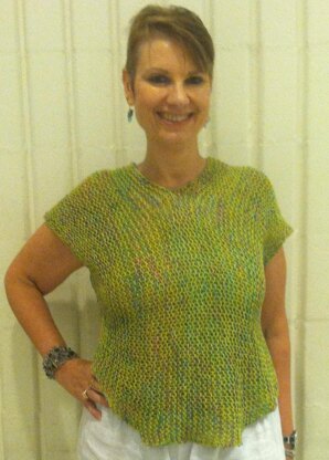 A flattering layering piece for all occassions and climates or wear alone. The uneven textural hemline contributes to the aesthetic bohemian freedon of expression in all of us. Garment is worked in one piece from the bottom back to the front with a "hole" bound off the the neck opening. Once bound off, the garment is then moved from the worked direction to a lengthwise position. It is this repositioning from the expected form along with the specified shaping that creates the flattering hem line. For a dressier look, select yarn with a bit of glitz.