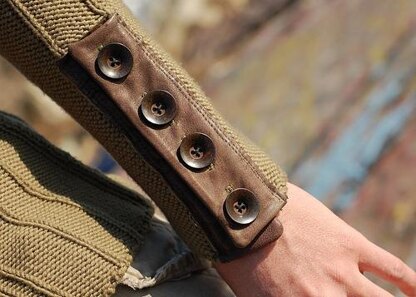 This man's sweater has some steam-punk appeal with its leather plackets and high-buttoned neck.