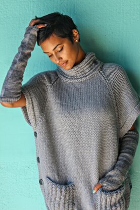 Right on trend, Isadora is a three-piece outfit complete with tunic length poncho, hat and elbow-length fingerless gloves. But there is no need to wear all pieces together, each piece has been designed to stand-alone or be worn in combination. Deep raglan armholes and a buttoned collar allow for layering options during the cooler months. The long fingerless gloves knit in tonal shades of grey accent beautifully the solid color poncho and matching hat. Poncho and hat are knit using Knit Picks Wool of the Andes Bulky, while the fingerless gloves are knit with a coordinating shade of Stroll Tonal Sock Yarn. This design originally appeared in Knit N Style magazine.