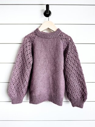 The Isadora Sweater (child size) is a delicate and eye-catching knit. It’s worked from the top down starting with a folded crewneck collar and then classic raglan shaping that allows for easy customization of the body and sleeve lengths. The showstopper bishop sleeves are knit in a lace pattern to create airy but dramatic sleeves.