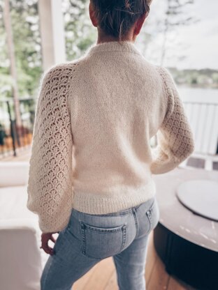 The Isadora Sweater is a showstopper with delicate and distinguished bishop sleeves. The lace is a six stitch repeat that makes for easy knitting while still creating a memorable finished sweater. It is knit as a top down raglan and in-the-round with seamless construction. The suggested positive ease is 2-6 inches (5-15 cm).