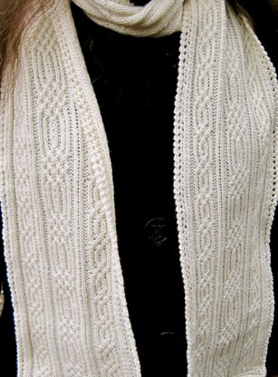 This is a pattern for a true alpine cabled scarf (as opposed to Aran cabling, which is the more familiar way of cabling). The knit stitches are knit primarily through the back loop, and although the scarf is not reversible, it is cabled on both sides. It is centered with a turtleneck that will keep you warm in spite of the lighter weight yarn.