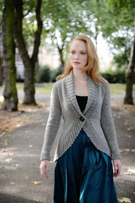 This tailcoat will be a statement piece in any wardrobe. It’s got a touch of old fashioned glamour with the curved edge, yet is still completely on trend with the chunky collar and central large button. The shape is very flattering, accentuating the hour glass figure. Fabulous as outerwear for the autumn or spring, lovely and warm as a cardigan for winter. Techniques used in this pattern include blackberry stitch, short row shaping and picking up stitches. Knitted on 5 and 6 mm straight needles. Tension: 16 sts and 23 rows to 10 cm square over Stocking Stitch using larger needles.