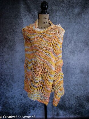 This is a rectangular shawl knit lengthwise from bottom up. The pattern is comprised of two stitch patterns; the Ocean Waves stitch pattern with waves over a background of Stockinette stitch and the Foaming Waves stitch pattern with a blend of Garter Stitch and lace. It is knit with a heavy worsted weight Merino and Silk yarn that has a lovely drape. This is a quick knit that is perfect for playing with both texture and lace.