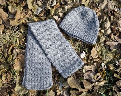 This is a crochet pattern for an interesting, yet simple, hat and scarf. It features a unique textured stitch which is achieved by a modified sideways cluster stitch. There is a photo tutorial of how to work this stitch included in the pattern.