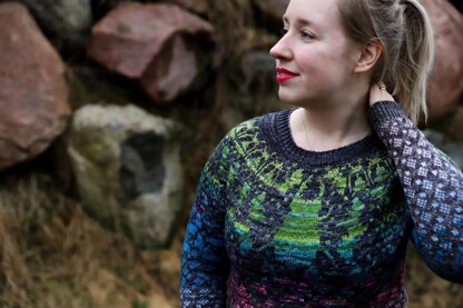 This sweater is worked top-down seamlessly. The sweater has a round yoke and an all-over colorwork pattern full of all sorts of insects that lets you play with your scrap yarns. You can use as many as you like or make a more subtle version with just one or two. The sweater has short row shaping for the back, long sleeves, and a cropped hem. The design would make a great summer tee as well. In that case, go for more ease (approx. 8’’ / 20 cm) and leave the sleeves short.