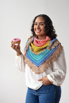 Designed with 12 donut-sprinkle-inspired fingering weight mini skeins and a warm, baked, dough-inspired full-sized skein of fingering weight yarn to tie them all together—you will love this shawl.