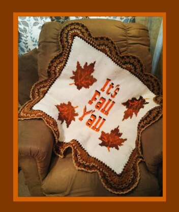 The perfect gift for someone who loves to decorate in Fall colors. A pretty lapghan in fall colors with falling leaves and with 'It's Fall Y'all' centered in the middle of the blanket. It also has a wide lacey border done in beautiful fall colors. It can be crocheted using the Tunisian (afghan stitch) or Single Crochet - Half Double Crochet if you want it a wee bit bigger.
