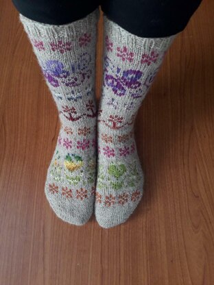 A pair of socks designed with stranded flowers and butterflies. A very fun knitting design and you can add as many stripes of flowers as you like in the leg. They're toe-up socks