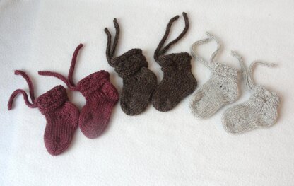 Adorable little sock-style booties for baby girls and boys. Seamless styled toes and heels using detailed short row instructions. Quick and easy little accessory to coordinate with unisex outfits. A fun and useful way to use up small bits of stashed yarn. I-cord ties may be contrast or monochromatic.