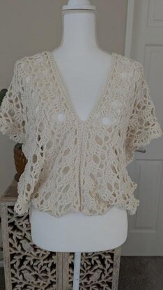 This handmade crochet bolero features a delicate cream butterfly lace pattern, crafted from a blend of 85% cotton and 15% polyester for a soft and durable finish. Designed for easy assembly, it consists of two simple rectangular pieces, making it a perfect project for both beginners and experienced crocheters. The adjustable tie strings on the sides allow for a customizable fit, adding both functionality and charm to this elegant piece. This bolero is an ideal addition to any wardrobe, offering a touch of bohemian elegance to various outfits. This bolero can be made with any type of yarn color and material, allowing for endless customization to suit personal style and preference.