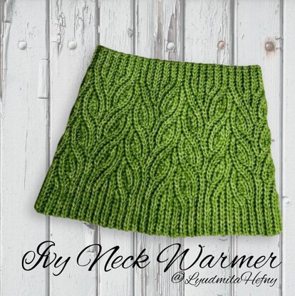 The Ivy Neck Warmer is made vertically, flat, in one piece. Repeating panels are connected as you go. The Ivy stitch pattern is created using short rows and slip stitches that are smoothly integrated into the upper and lower ribbing edges.