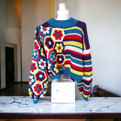 This pattern is for a slightly cropped baggy sweater. It should fall slightly below the belly button just past the top of the waistband of mid rise pants (this of course is relative to individual body shape)