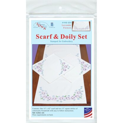 Create beautiful dresser scarf and matching doilies using this great kit. The stitching designs have been stamped using ink that washes away with any liquid and the fabric is a cotton/poly blend broadcloth. This package contains one 15x42 inch table scarf with a perle edge finish, two 12x12 inch matching doilies stamped in wash away ink, instructions for completion and care and a complete list of DMC floss requirements. Hoop, needle and floss all sold separately. Design: Lavender Flowers. Made in USA.