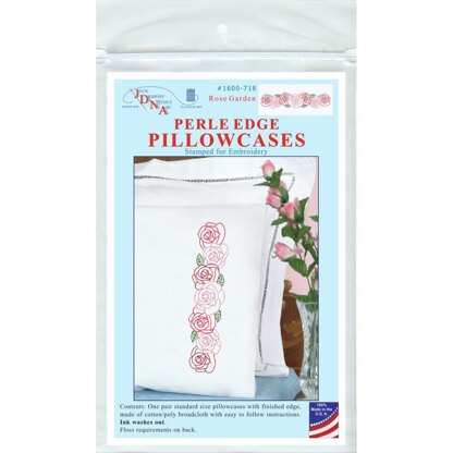 Create beautiful pillowcases using this great kit. The stitching designs have been stamped using ink that washes away with any liquid and the fabric is a cotton/poly blend broadcloth. This package contains one pair of standard size pillowcases with finished lace edges, instructions for completion and care and a complete list of DMC floss requirements. Hoop, needle and floss sold separately. Design: Rose Garden. Made in USA.