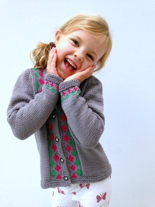 Intermediate knitters will enjoy the cardigan's unusual and interesting construction. Knit from the bottom up and entirely seamless, the cardigan features stranded front bands with a simple charted motif. Stitches are picked up to knit the sleeves, which are shaped with short row shoulder caps.