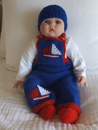 These baby’s 8ply bib and braces overalls are knitted in easy garter and stocking stitch then boat motifs are embroidered (working form a graph) on the right leg and chest.