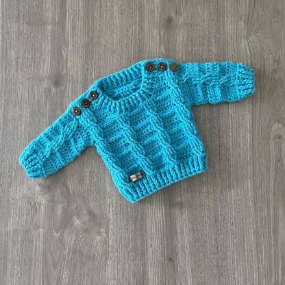 JACK CROCHET BABY AND KIDS SWEATER CROCHET PATTERN PDF - A cozy textured cabled baby and kids pullover sweater available in 9 sizes from Newborn to 10 years. Made seamless all in one bottom up so no sewing of seams. Unisex - Boy or Girl.