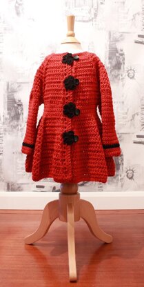 The design features a fitted top, a full skirt and flower shaped button fasteners.