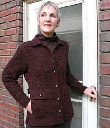 A button-down jacket in seven sizes, knit in an allover tweedy textured stitch, with set-in sleeves, hip pockets with flap and side entry, side hem slits, optional half belt, and shirt collar (opens to form lapels). All pieces are knit flat, bottom up, and seamed.
