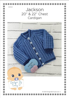 Jackson is a unisex Baby Knitting Pattern for a beautiful cardigan. It is 2 larger sizes of my popular Blainn pattern. It is made using DK yarn with 3.25mm & 4mm needles and will fit a 20" and 22" chest (finished size) 150g of DK yarn is required for each size