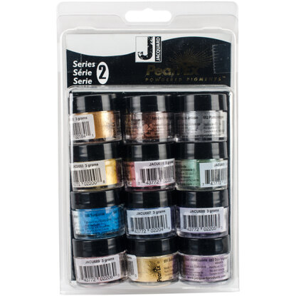 Jacquard Products-Pearl Ex Powdered Pigments Series 2. These powdered pigments work like magic, they can be used to simulate metallic sheens, leather, antigue metals, raku pottery, shimmering pearlescents, and much more! These powders can be mixed with with just about any medium and applied to most surfaces! Mix with paint (acrylic and oil), clays, varnish, even wax. Apply to clay, glass, metal, wood, paper, fabric, and both list go on endlessly. Non- toxic, neutral ph, colorfast, will not tarnish or fade, and is ideal for archival applications. Includes twelve 3 gram jars: aztec gold(658), antique copper(661), antique silver(662), duo violet- brass(693), bright yellow(683), flamingo pink(684), spring green(685), turquoise(686), true blue(687), misty lavender(688), blue russet(689), and solar gold(691). Conforms to ASTM D4236. Made in USA.