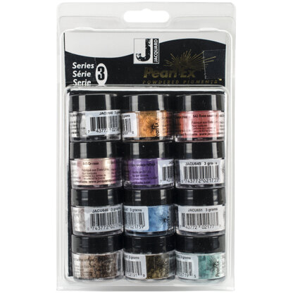 Jacquard-Pearl Ex Powdered Pigments Series 3. These powdered pigments work like magic, they can be used to simulate metallic sheens, leather, antigue metals, raku pottery, shimmering pearlescents, and much more! These powders can be mixed with with just about any medium and applied to most surfaces! Mix with paint (acrylic and oil), clays, varnish, even wax. Apply to clay, glass, metal, wood, paper, fabric, and both list go on endlessly. Non- toxic, neutral ph, colorfast, will not tarnish or fade, and is ideal for archival applications. Includes twelve 3 gram jars: carbon black(640), pumpkin orange(641), salmon pink(642), pink gold(643), reflex violet(644), grey lavender(645), mink(646), sky blue(647), pearl white(651), antique bronze(660), sunset gold(665), duo blue-green(681). Conforms to ASTM D4236. Made in USA.