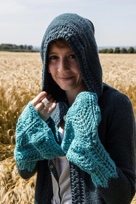 This is a pattern for a top-down seamless hooded jacket. The sleeves and lower body flare out into a chunky lace pattern reminiscent of peacock feathers. This pattern can be worked in one or two colours, and as it is worked from the top down, the length of body and sleeves can be adapted.