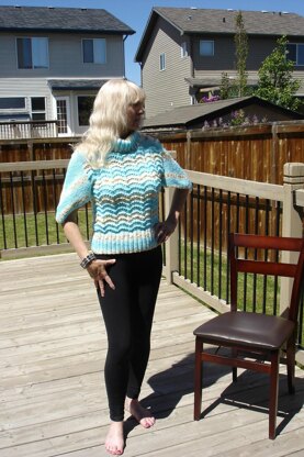 This is a unique looking pullover. The pattern brings out the striping work beautifully. You can wear this on its own or over a light top. Use a baby yarn or light weight fingering or sport weight yarn. 26 sts and 24 rows = 4" or 10 cm. Find a yarn with self striping as it will be hi-lited by the swirl of the pattern. Size variation for a longer version included in the pattern. You will need between 1100 and 1200 yards and if you choose to make it larger you will require another ball.