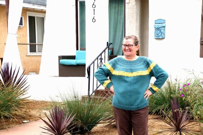 After a basic neck ribbing, the main color is doubled up with a strand of black mohair to create the incrementally increasing stripes of the yoke. The last stripe is of a golden col-or, partially doubled up with a strand of golden mohair. Knitting stitches together with stitches of the row below and on the wrong side, creates these garter ridges within the golden stripe. The rest of this sweater is easy. Short rows lift the back before the body and sleeves are separated and completed in-the round. Before the ribbing cuff another dark mohair stripe followed by a golden stripe decorates the sleeves.