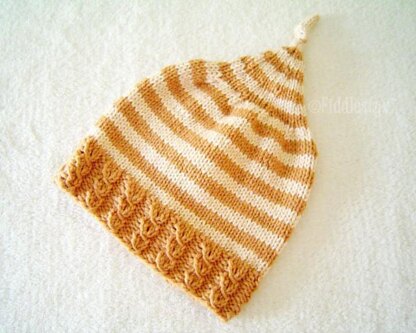 A faux-cable ribbing sets this simple striped pixie hat apart from the rest. Knit in the round and ending with a top knot it’s a super-quick, super-cute knit.