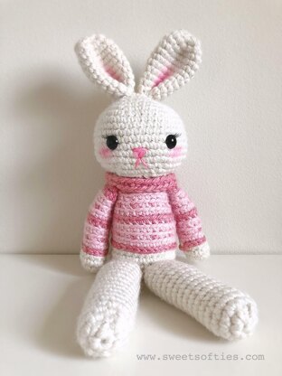 The "Jane the Jumbo Bunny" Pattern provides written instructions with photo references for crocheting this ginormous bunny rabbit in a sweater. Jane’s unique design uses crochet methods to join the legs and to the body without any sewing. This project is suitable for intermediate crocheters who are familiar with the basic stitches and principles of doll-making. Jane makes for a cute and impressively large handmade gift for baby showers, nurseries, children, and bunny lovers! If desired, crocheters can also follow the same pattern instructions using a smaller hook and a medium weight yarn to produce a smaller stuffed animal.