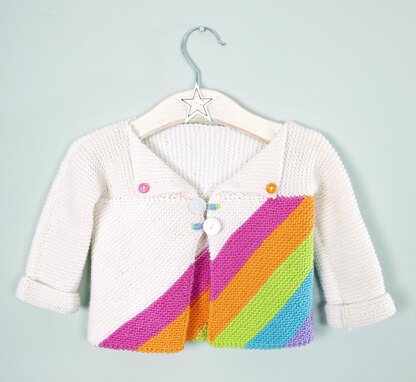 The inspiration for this design came from a picture of a rainbow-coloured jumper drawn by my seven-year-old daughter. It got me thinking about how to introduce stripes in a more interesting way than simply horizontally or vertically. Garter stitch is ideal for babies and toddlers because there are no holes for fingers to explore and the bouncy, stretchy fabric moulds well to moving and growing bodies.