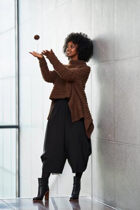 Japana – whispering in Japanese - is a high-low pullover in a ridge pattern with swinging side panels that ends in a high standing collar. The side panels are picked up and knitted after the side seams are done. Wear it as you like; hanging loose or gathered with a belt or with a shawlpin at the front. Japana is knitted in the lovely wool and silk yarn Madara from Noro.