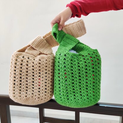 This cute tote bag is perfect for everyday use! It has an adorable look about it. It can be used as a market bag or hobby bag it is very versatile. This is pattern for women. This beautiful bag is easy and works up fast, it is made in rounds, no sewing needed at all. It is called the Japanese knot bag because of the way it closed on top with the handles. We will use an easy beginner lacy stitch.