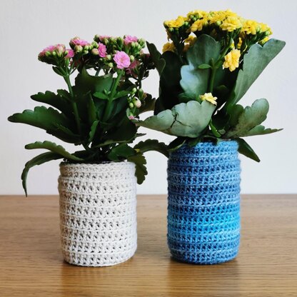 This crochet pattern holds its shape beautifully on it's own, or can cover any size jar/pot/container you have. It makes a beautiful vase cover, pen holder, crochet hook holder, or any kind of pot or container you'd like. It is a beautiful quick and easy beginner pattern and is written in American Standard crochet terms.