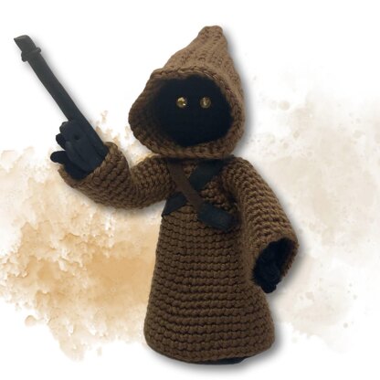 Worked in just two colours of worsted weight yarns, this little desert swindler works up quickly and easily. He has wired limbs for posability and droid capture, as well as a polymer clay blaster (just in case there’s trouble!). This pattern is 9 pages long with 15 colour photos to help you along the way.