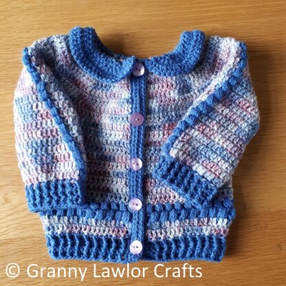 The Stonewash DK yarn by James C Brett has a lovely variegated colourway (unimaginatively called SW4!) which has a denim blue in it with pinks and greys. Stylecraft Special DK in Denim picks up on the blue to give a lovely contrast. For Newborn (3m, 6m, 9m, 12m, 18m, 24m) you'll need approx: 70g (80g, 100g, 125g, 150g, 175g, 200g) of the main colour and 40g (40g, 50g, 60g, 60g, 70g, 80g) of the contrast colour. 4-5 Buttons pick out the pink to complete the look.
