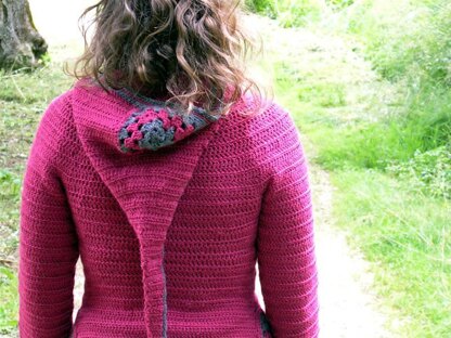 This fitted cardigan is crocheted all in one piece, with a very long hood.