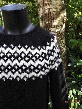 Jens Lyn is a sweater/pullover worked from the bottom edge and up with a 2-colored pattern on the yoke, at the bottom of the body and at the bottom of the sleeves. Lyn is a Danish word for 'flash' or 'lightning', This sweater has a combined round and raglan yoke and sleeve construction.