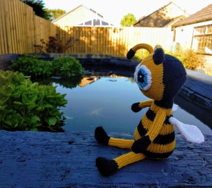 Jerry the Berry Bee is knitted flat, seamed and stuffed.