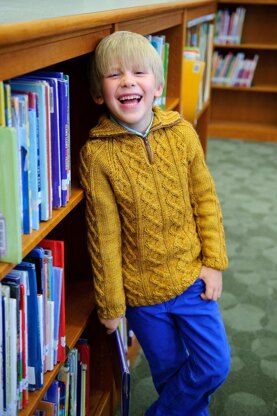 This toasty warm sweater features a double-sided collar and a half-zip placket to keep the appropriate amount of warmth in and the cold out. The easy-to-memorize cable repeat adds a textureal sophistication for a true modern "little man" look. Jesse is wearing the size 8.