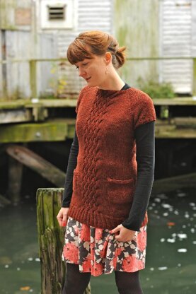 Jetty is a top down tunic worked in one piece with raglan shaping. An easy to work cable pattern is worked down the center front and back and 2 pockets are worked in on the front.