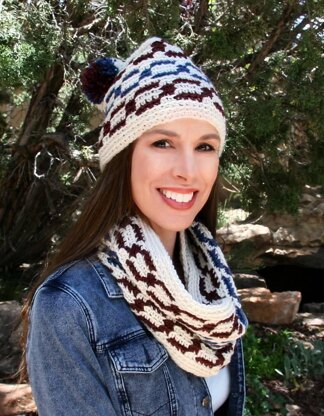 Glistening circles of color embedded in a soft sea of white reminds me of gorgeous colorful gems sitting on a snowy white bank. The set is worked in the round using my Fair-Isle Crochet technique and worsted weight yarn. And you will love that it is adjustable so you can make the cowl as long wide as you want and the hat fit any size head. Make it in a weekend!