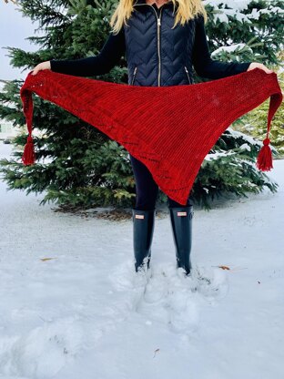 Perfect for this Christmas or anytime you want to add a pop of color! This shawl is worked in one piece from one corner to the other, increasing on one side every other row; creating an asymmetrical triangle with a lace cable pattern running along edge.