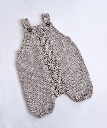 This is a unisex baby dungaree with a center front lace motif. The dungaree is knitted from the bottom up. It starts with the legs, which are knitted flat and then joined in a round. Most of the piece is worked in the round with minimal stitching.