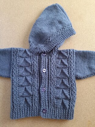 Baby cardigan (not pictured) and hoodie in textured design with mock cable panels, age 0-6 months. Actual measurements chest 18", length 9.5", sleeve 5"