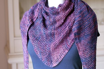 "Joanna” is an easy to knit triangle shawl with an interesting surface. The combination of the hand-dyed yarn and the stripes of changing left and right leaned crosses (resp cables) make it a real eyecatcher.