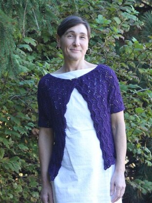 Have you found the perfect dress for a summer event–perfect that is, but for the missing sleeves? This happened to me when planning to attend my niece’s wedding. I needed a garment to cover my shoulders that was pretty enough to complement my dress and yet cool enough to wear in the summer heat. This light-weight cardigan fit the bill perfectly. It is waist length in the back, has a scoop neckline, short sleeves and fronts that overlap at the neck then drape open. It is worked top-down seamlessly and comes in 9 sizes (XS to 5X). The construction is deceptively simple with only one row of increases at the neck. From there everything is worked evenly in the Traveling Vine stitch pattern. The cardi is shown here in Knit Picks CotLin which was comfortable for outdoor pictures in 100 degree heat and transitioned nicely to the uber-cold air conditioned banquet hall. CotLin is a DK weight, but the pattern works just as well with a fingering or worsted weight yarn–provided you are a
